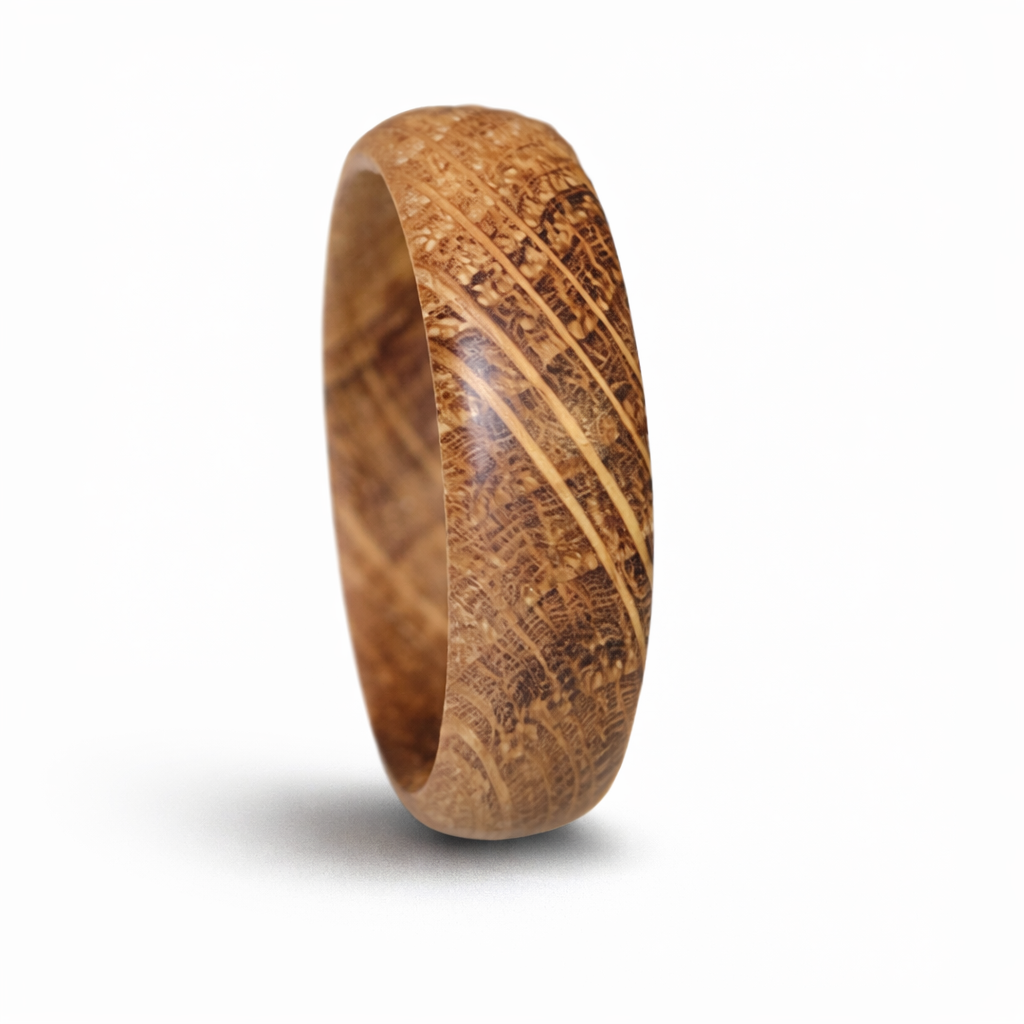 Prsten od Hrasta ručno izrađen od punog drveta sa prirodnim godovima i braon boje. Svaki prsten od hrasta je unikatan i naglašava prirodnu lepotu drveta.