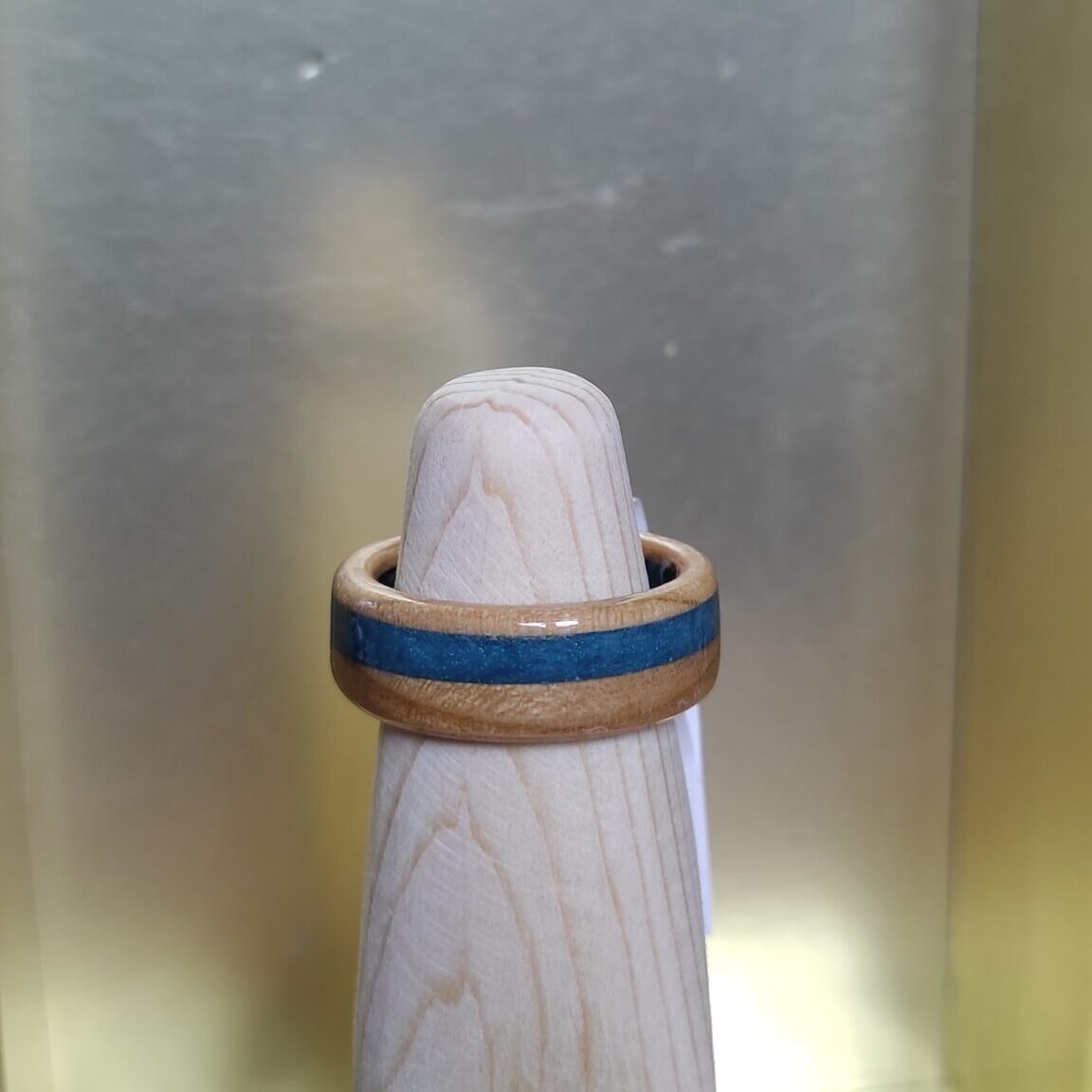 Ovaj prelepi ručno izrađeni drveni prsten odiše toplinom prirode i minimalizmom. Napravljen je od pažljivo odabranog drveta i epoxy smole plave boje, sa glatkom, zaobljenom površinom koja pruža izuzetnu udobnost pri nošenju.