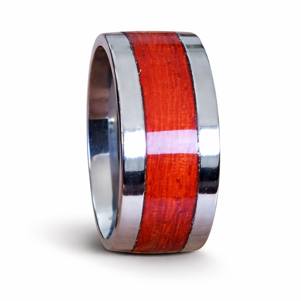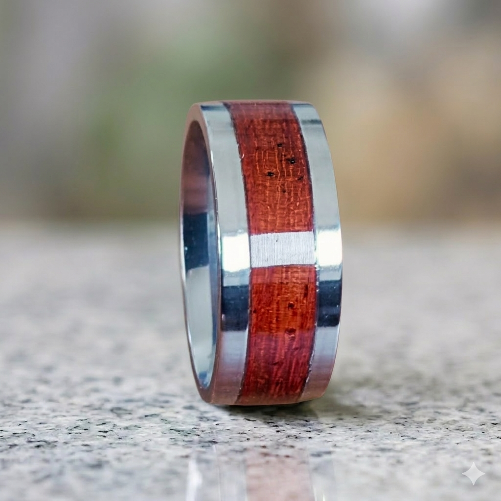 Minimalistički prsten iz kolekcije Steel Line, izrađen od prirodnog ružinog drveta i čelika. Kombinacija toplog drveta i hladnog metala stvara elegantan i moderan izgled. Svaki prsten je ručno izrađen i jedinstven zbog prirodne strukture drveta.